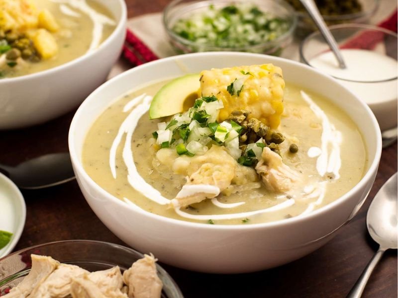 Ajiaco is a creamy chicken and potato soup from Bogotá. It has a special Colombian flavor because of guasca, a local herb added to the dish. The soup also includes corn and different types of potatoes, making it thick and hearty. Ajiaco is usually served with rice, avocado, and capers on the side. It’s a comforting meal, perfect for cool mornings or family gatherings. Colombians enjoy it because it fills you up and tastes like home. Ajiaco is a must-try for anyone exploring Colombian food, as it combines warmth, flavor, and tradition in every spoonful.