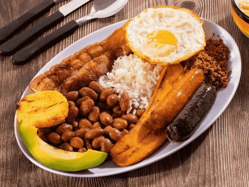 The most famous Colombian food is Bandeja Paisa. It’s a big and delicious meal with rice, beans, pork belly, and more.
