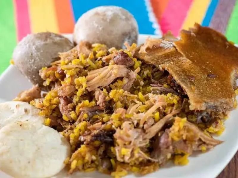 Arroz con Pollo is a colorful Colombian dish made with rice, chicken, vegetables, and spices. First, the chicken is cooked with the vegetables, and then it is mixed with rice, creating a flavorful and hearty meal. People often serve it for lunch or family gatherings because it is simple, filling, and satisfying. Additionally, it is a favorite comfort food that children and adults enjoy equally. The combination of rice, chicken, and vegetables makes every bite tasty and colorful. Therefore, Arroz con Pollo is a great introduction to Colombian food for anyone visiting the country.