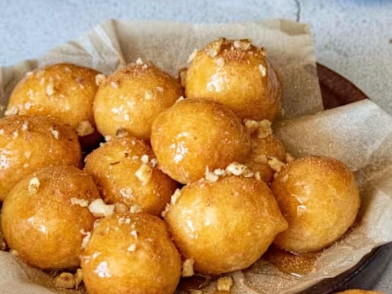 Loukoumades are golden, bite-sized doughnuts that have been part of Greek food culture since ancient times. Fried until crisp, they’re drizzled with honey and sprinkled with cinnamon and crushed nuts.