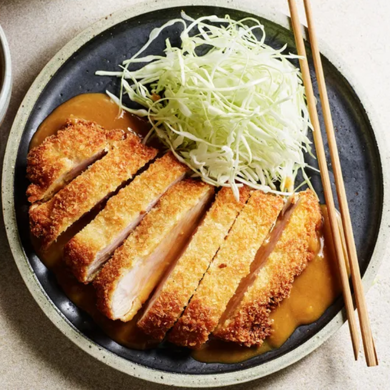 - Serve with tonkatsu sauce and cabbage.