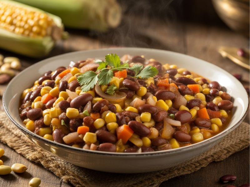 - Then, mix the cooked maize and beans with the sautéed vegetables.
