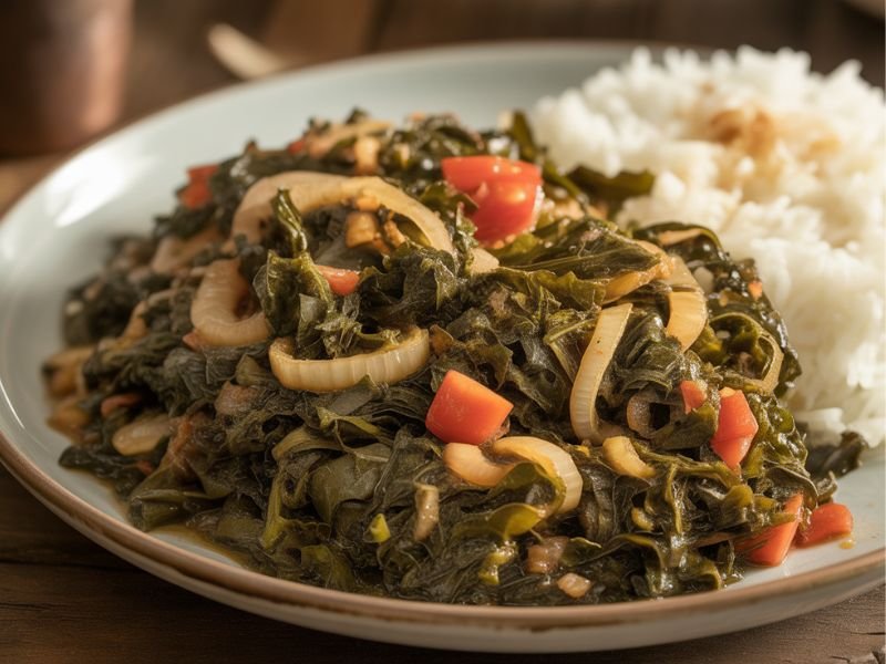 Sukuma Wiki is a sautéed kale dish, simple and nutritious, often paired with ugali. It’s lightly cooked with onions, tomatoes, and a little oil, keeping it fresh and flavorful. This dish is a daily favorite in Kenyan homes because it’s healthy, easy to prepare, and affordable. Sukuma Wiki adds color and vitamins to any meal and complements both meat and vegan dishes perfectly.