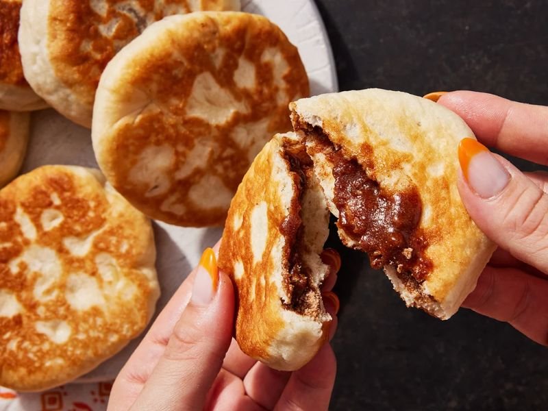 Hotteok is a sweet Korean pancake that’s especially popular during the winter season. The dough, made from wheat flour and yeast, is filled with a mixture of brown sugar, cinnamon, and chopped nuts before being pan-fried to golden perfection. When bitten into, the warm, melted sugar filling oozes out, creating a comforting treat that’s both chewy and crispy. Street vendors often sell Hotteok freshly made, filling the air with a sweet aroma. It’s a nostalgic snack that captures the warmth and sweetness of Korean winter traditions.
