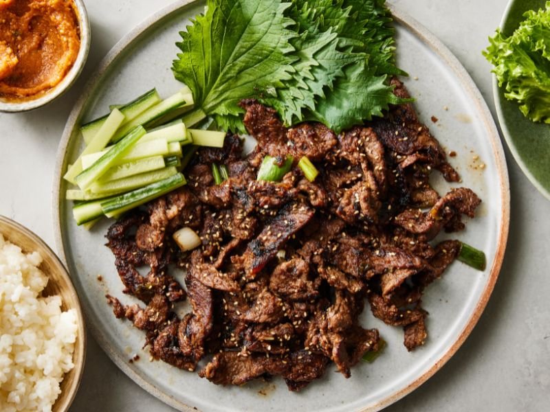 Bulgogi is a beloved Korean dish made from thinly sliced marinated beef grilled or pan-cooked to perfection. The meat is soaked in a savory-sweet marinade featuring soy sauce, sugar, garlic, sesame oil, and a hint of pepper. This combination gives the beef its tender texture and caramelized flavor when cooked. Bulgogi is often enjoyed wrapped in lettuce with rice, garlic, and ssamjang (spicy paste). Sometimes it’s prepared at the table on a grill, creating a fun, social dining experience. Whether served with rice or as part of a larger meal, bulgogi captures the perfect balance of sweetness, smokiness, and umami flavors.