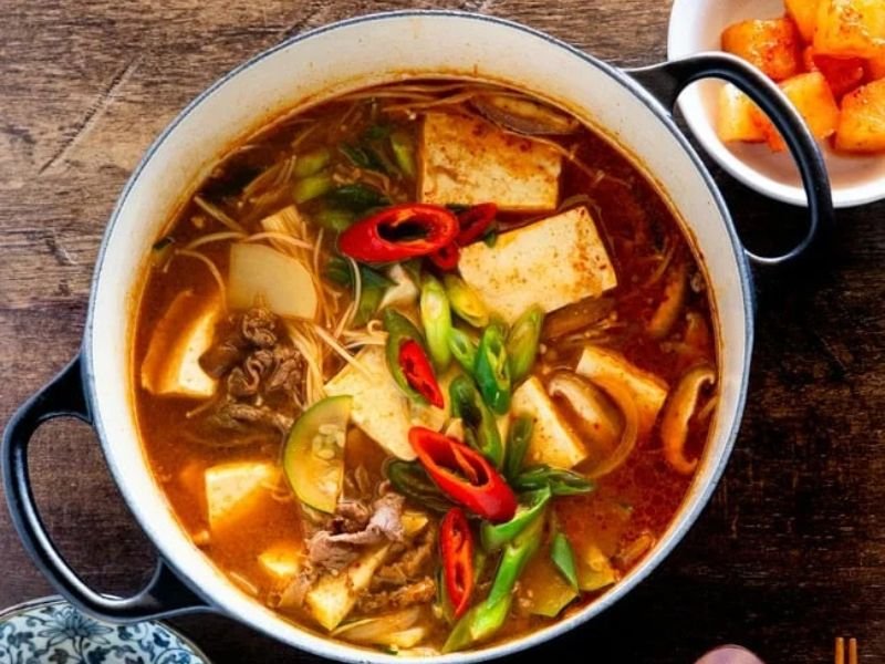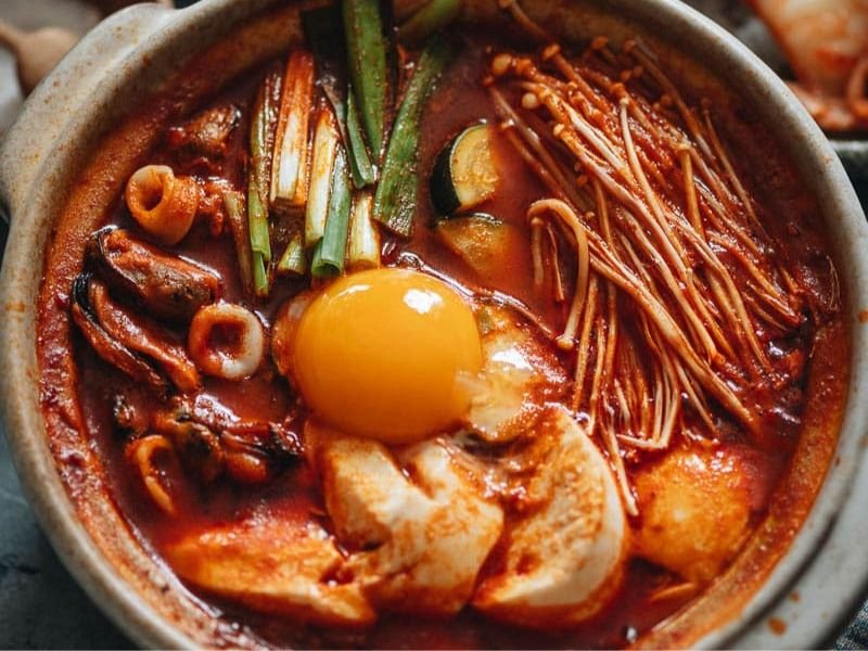 Sundubu Jjigae is a spicy, comforting stew made with uncurdled soft tofu (sundubu), vegetables, and often seafood or thin slices of meat. The broth, infused with gochugaru and garlic, is rich, fiery, and deeply satisfying. A raw egg is often cracked into the bubbling stew just before serving, creating a creamy texture as it cooks. Served in a hot stone pot, this dish is enjoyed with rice and kimchi on the side. Sundubu Jjigae perfectly balances soft textures with bold flavors, making it a go-to meal during cold weather or whenever comfort food is needed.
