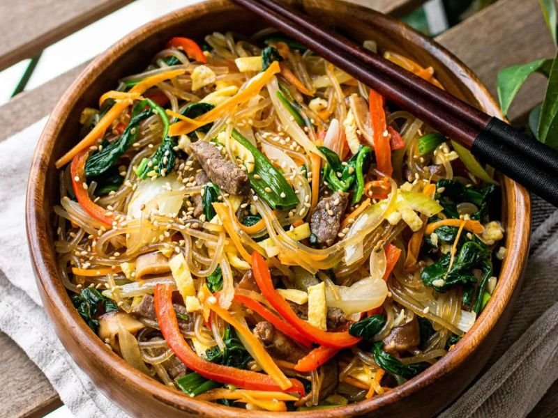 Japchae is a delicious and colorful stir-fried noodle dish made with glass noodles (dangmyeon) derived from sweet potato starch. It’s mixed with an assortment of vegetables such as carrots, spinach, onions, and mushrooms, and often includes slices of beef or pork. The dish is seasoned with soy sauce, sesame oil, and a touch of sugar, giving it a subtly sweet and nutty flavor. Japchae can be served warm or at room temperature, making it a popular choice for celebrations and festive gatherings. Its glossy noodles, vibrant vegetables, and fragrant aroma make it both visually appealing and irresistibly tasty.