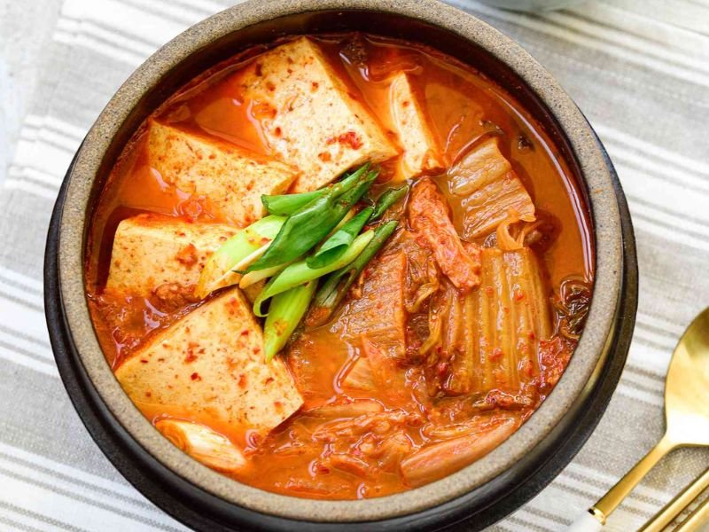 Kimchi Jjigae is one of Korea’s most beloved comfort foods — a hearty, spicy stew made primarily with aged kimchi, pork, tofu, and sometimes noodles or seafood. The older, fermented kimchi adds deep tangy flavor, while gochugaru (red pepper flakes) enhances the spice. The stew is simmered until the broth becomes rich and flavorful, often served bubbling hot in a stone pot. Kimchi Jjigae pairs perfectly with a bowl of steamed rice and is a common home-cooked dish in Korean households. It’s warming, satisfying, and a true taste of Korean everyday cuisine that showcases the depth of fermented flavors.