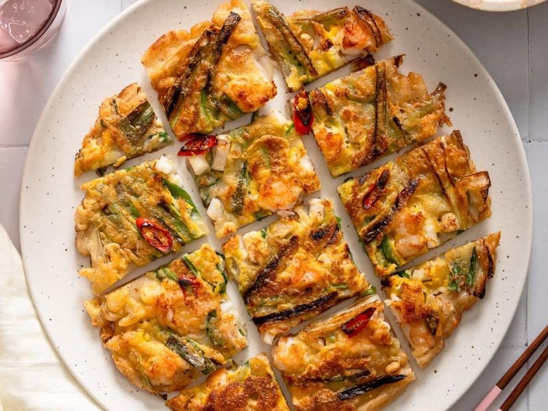 Pajeon is a savory Korean pancake made primarily with scallions (pa) in a light batter of flour, eggs, and water. It’s crispy on the outside and soft inside, often featuring seafood such as squid, shrimp, or clams in the popular variation called Haemul Pajeon. The pancake is usually served with a soy-based dipping sauce that enhances its umami flavor. Pajeon is a favorite dish on rainy days in Korea, often enjoyed with makgeolli (rice wine). Its balance of crispiness, freshness, and mild savoriness makes it an irresistible comfort food.