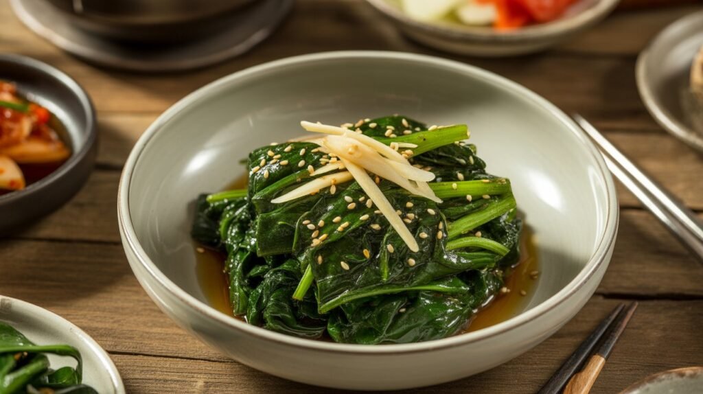 Sigeumchi Namul is a light and healthy Korean side dish made from blanched spinach seasoned with garlic, sesame oil, soy sauce, and sesame seeds. The spinach retains a fresh, bright green color and a slightly nutty aroma. This simple dish is often part of bibimbap or a typical Korean meal set, adding freshness and nutrition to the table. Its clean, savory flavor perfectly complements spicy or grilled dishes. Sigeumchi Namul showcases the Korean approach to simplicity — transforming basic ingredients into dishes full of balance, health, and harmony.