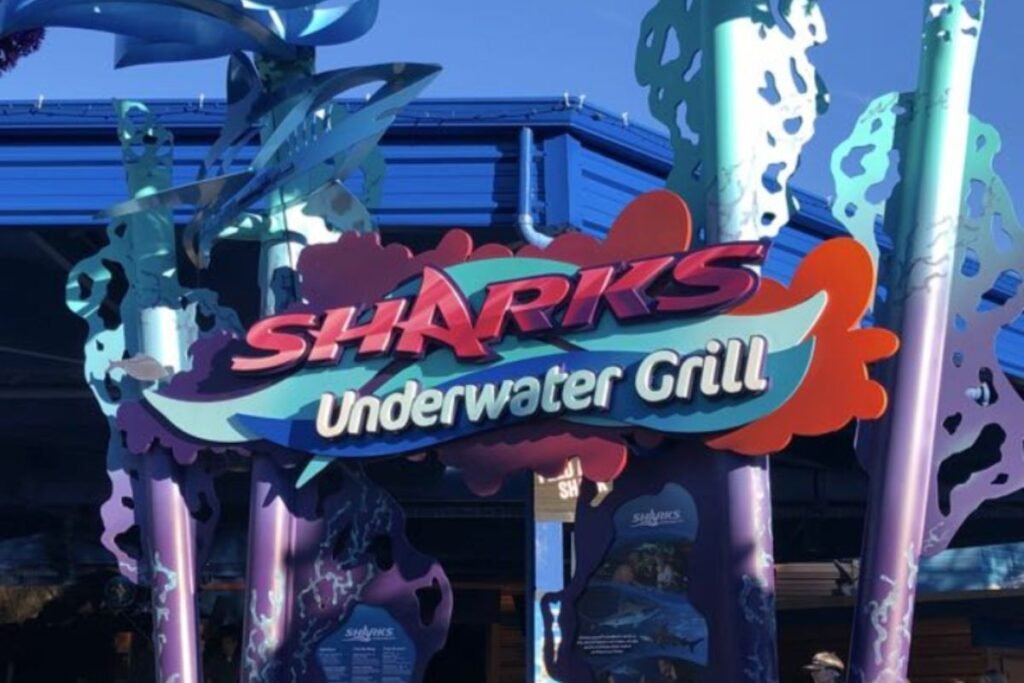 Located inside SeaWorld Orlando, the Sharks Underwater Grill gives you a full-service restaurant setting with floor-to-ceiling windows into a massive aquarium filled with sharks and other marine life.