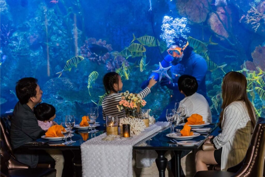 - Concept: Guests dine around a large 50,000-gallon centerpiece aquarium, with floor-to-ceiling viewing of marine life while enjoying their meal.