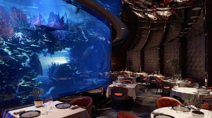 Set in the resort Atlantis The Palm, this restaurant places diners near large aquarium windows, part of the resort’s Ambassador Lagoon, giving a sense of underwater dining with sea creatures visible from the dining room.