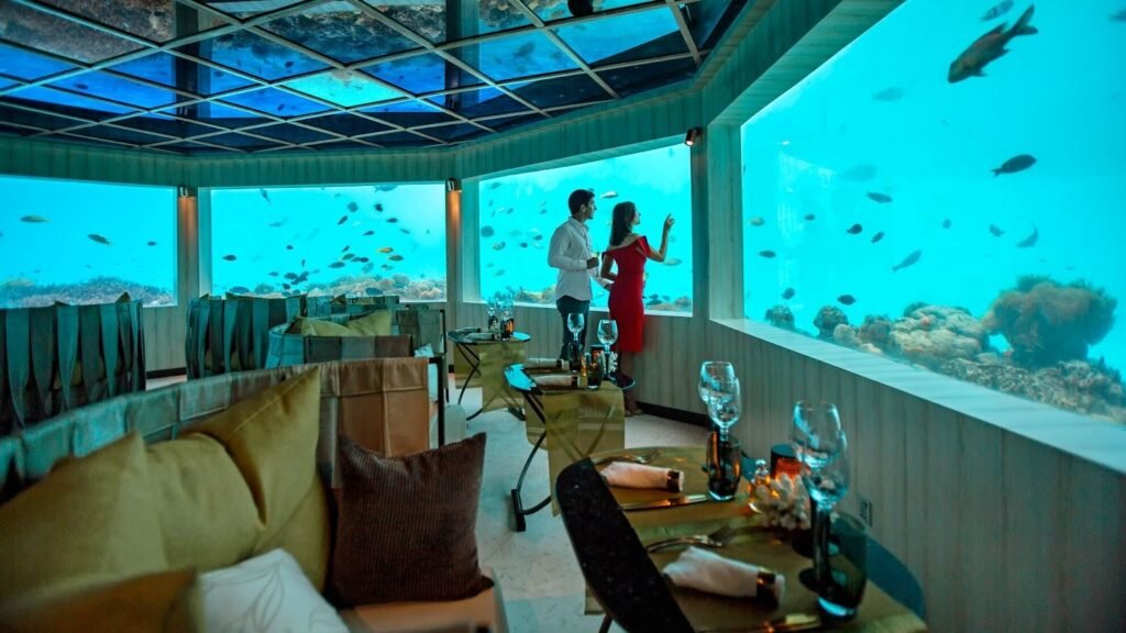 At Hurawalhi Island Resort, this restaurant lies 5.8 metres below the surface and boasts an all‑glass dome giving diners 360° underwater views.